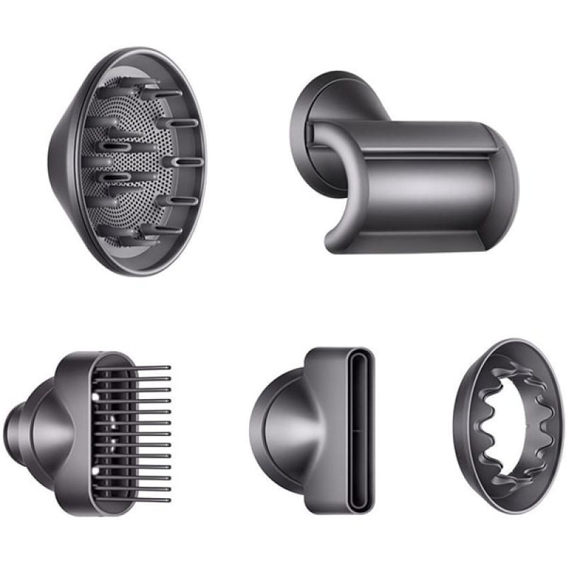 Фен с пятью насадками: насадка для укладки непослушных волос, концентратор для точной укладки, диффузор для создания объёма и текстуры, насадка для деликатной сушки волос, а также гребень с широкими зубьями. В комплект также входит инструкция. |